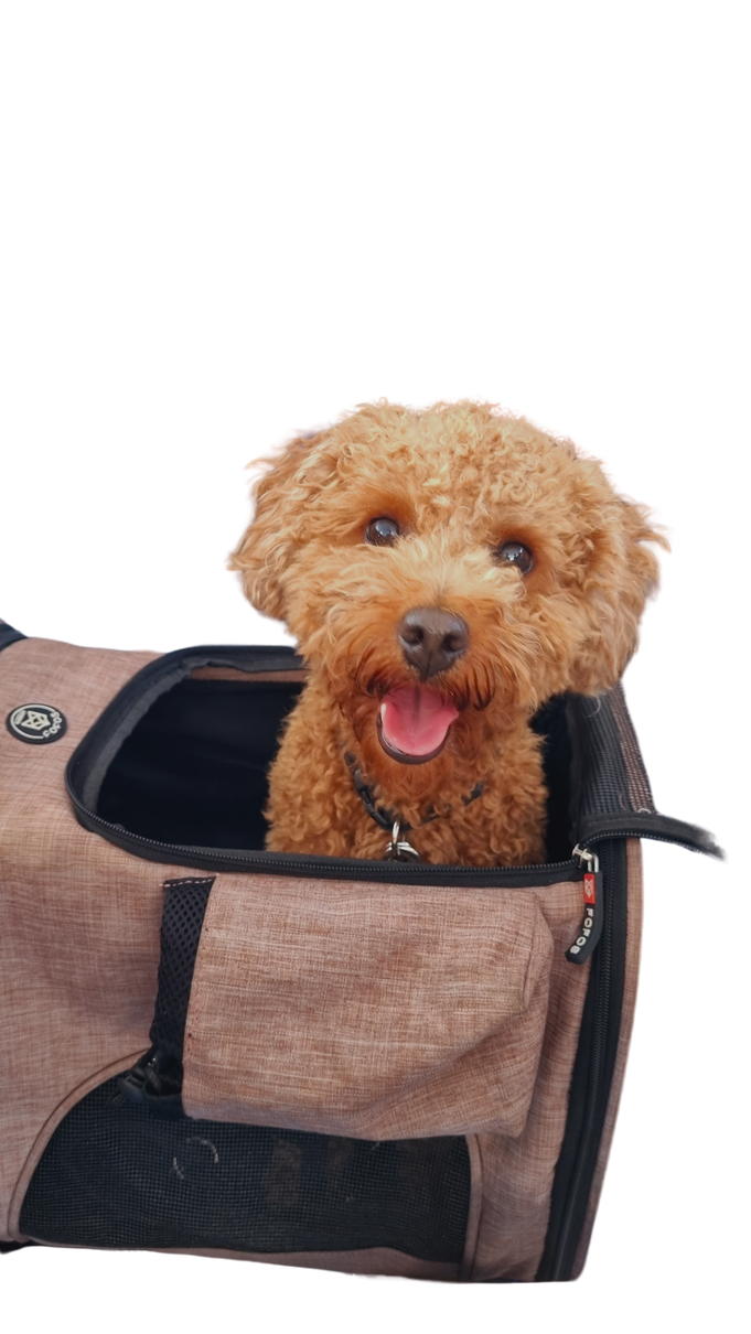 Gewöhnt euren Hund so früh wie möglich an seine Hundetasche. (Hundetaschen sind ausschließlich in der Flugzeugkabine erlaubt. Hundeboxen dagegen nur im Frachtraum.)